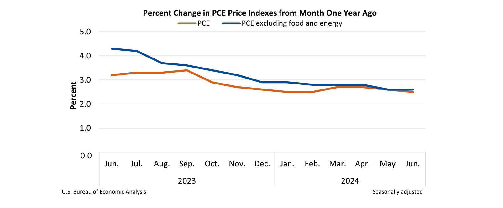 The Personal Consumption Expenditures (PCE) price index for June 2024 revealed a deceleration in inflation. Core PCE inflation, which excludes volatile food and energy prices, increased 2.6% year over year (.2% monthly increase). Overall, PCE prices (including food & energy prices) increased by 0.1% for the month, showing a year-over-year rise of 2.5%.